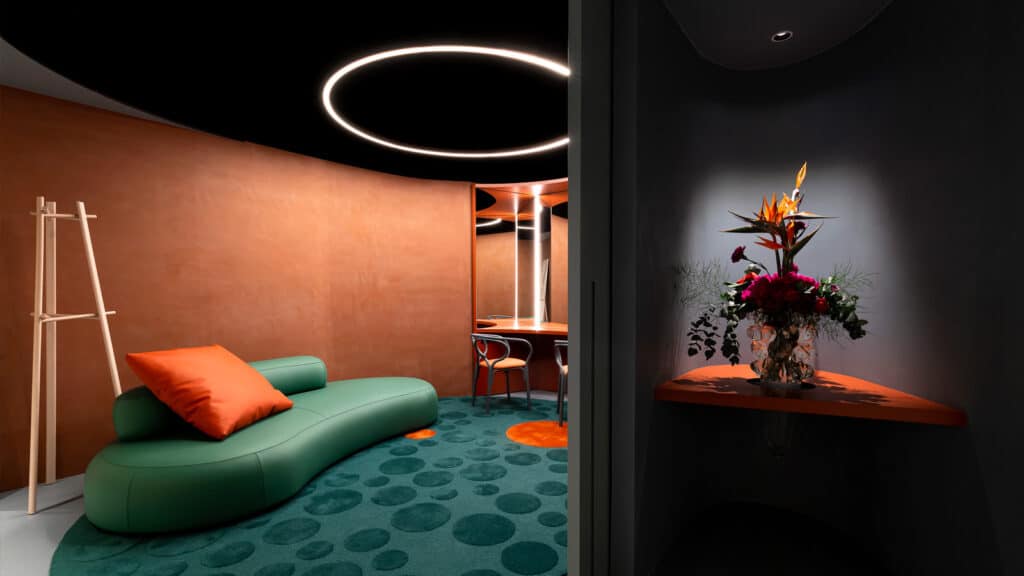 La couleur n’est plus appliquée, elle est composée. Murs, assises, textiles, objets et lumière participent d’un même récit. L’intérieur devient un cocon cohérent, pensé dans sa globalité.