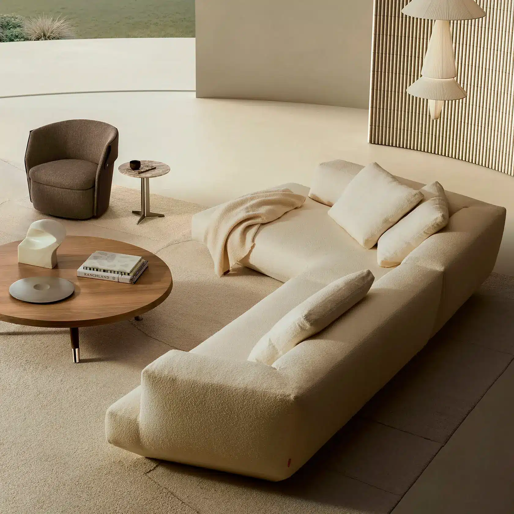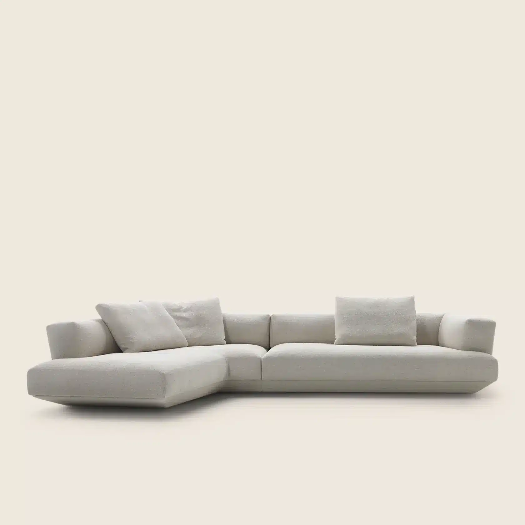 La structure interne supporte des dimensions généreuses de 350 cm tout en garantissant une stabilité rigide. Le rembourrage repose sur un système multicouche à densité différenciée, optimisé pour offrir une souplesse d’accueil constante et un maintien durable. Ce modèle est revêtu du tissu ERCOLANO (Catégorie Extra), une fibre de haute facture sélectionnée pour sa résistance et sa texture riche. Chaque étape de la fabrication, de l’ajustement du cadre aux coutures de finition, témoigne du standard d’excellence industrielle de la maison Flexform.