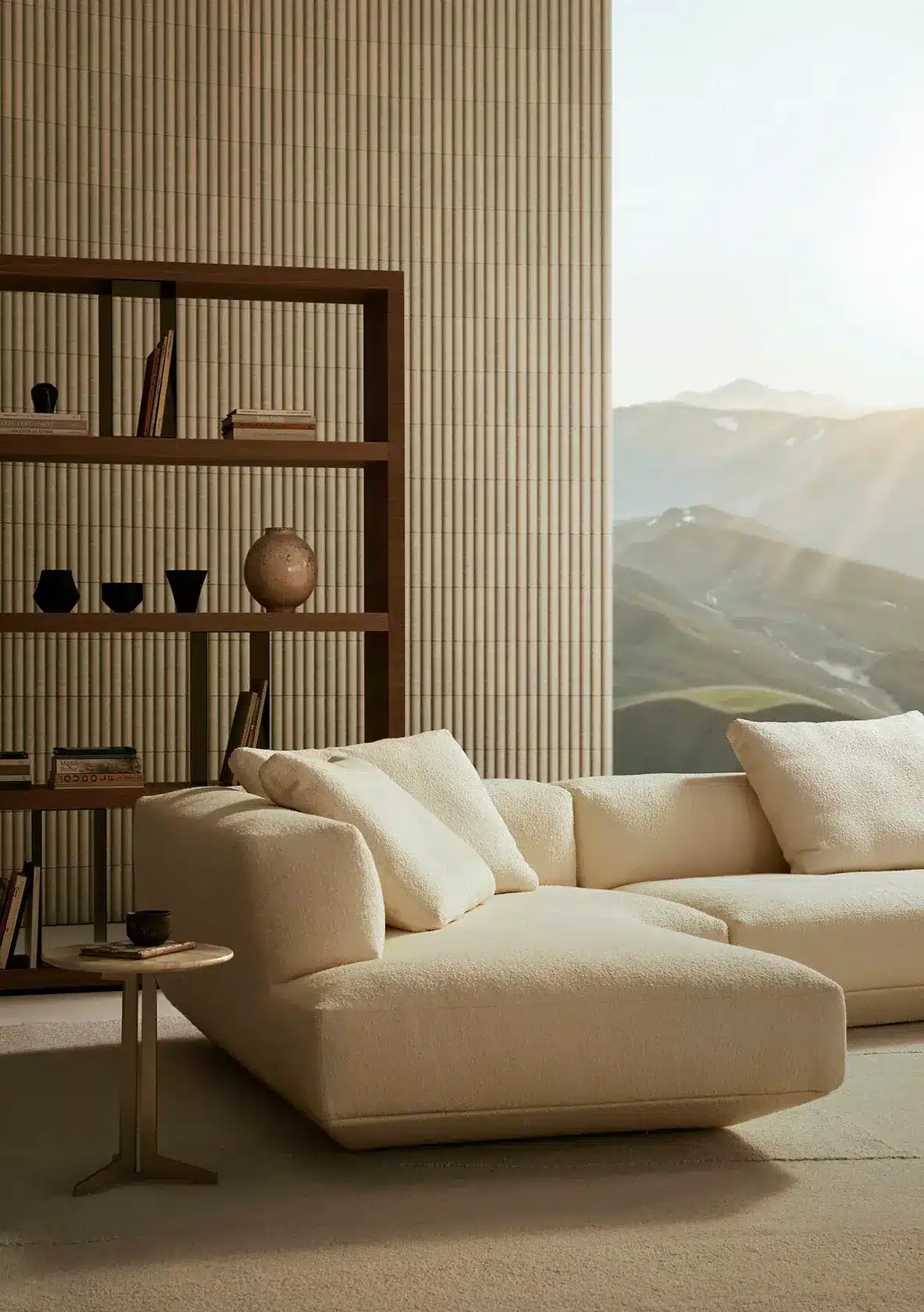 L’architecte Antonio Citterio signe le canapé Loungescape pour Flexform. Ce modèle repose sur une structure monocoque qui réunit l’assise et les volumes moelleux en une unité. Les formes organiques respectent un équilibre précis entre les proportions et les inclinaisons. Cette pièce structure l’espace de vie avec ses volumes arrondis et est une vraie invitation au confort. L’élément technique phare demeure sa base biseautée. Ce détail d’ingénierie allège la silhouette visuelle.
